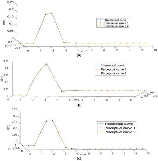 Comparison curves of measured and perceived trajectories in three-dimensional linear and bending states. (a) The three-dimensional linear. (b) 3D bending state 1. (c) 3D bending state 2.