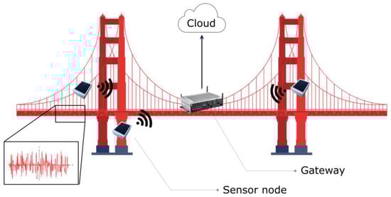 The proposed monitoring system is made up of a gateway and wireless sensor nodes, which are mounted on the structure. The sensor nodes acquire vibration data and transmit them wirelessly to the gateway, which has the role of a central acquisition unit (Figure 1). The communication protocol chosen for the wireless side is the BLE, as already pointed out in Section 1.