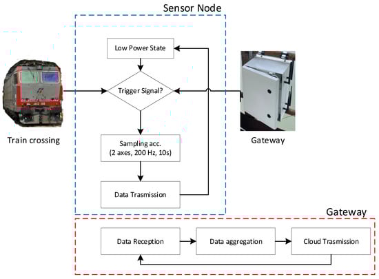 So, when a significant disturbance force excites the whole structure, like the one generated when a train crosses the bridge, the accelerometer triggers the node as described before. Then, the sensor node switches to the full-operating condition and samples the acceleration values with a sampling frequency equal to 200 Hz for 10 s, both on the vertical and the lateral axis. When the acquisition is over, the data are divided into some packages and then sent to the gateway, together with some other information (such as the timespan, the battery voltage, the voltage on the PV panel, the power consumption, and the temperature). Once all the data have been properly transmitted, the sensor node switches again to the low-power condition and the gateway uploads the collected data on the cloud, as shown in Figure 3.