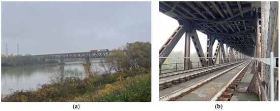 The Bressana railway bridge on the Po River is located near the city of Pavia, in Lombardy. The bridge crosses the river on three spans approximately 77 m long each (Figure 4a). The bridge is constituted of a truss steel structure with a double deck; the lower deck is devoted to the railway traffic while the upper one is reserved for the vehicular traffic (Figure 4b).