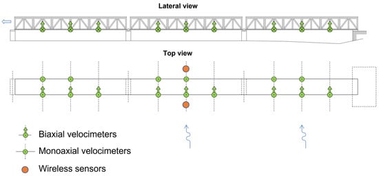 First, the permanent monitoring system, already installed on the bridge for monitoring activities, is briefly described. The schematic setup of the system is shown in Figure 5. This system consists of 15 wired velocimeters, 5 for each span. The upstream velocimeters (placed at the bottom of the top view in Figure 5) are biaxial sensors that measure the lateral and the vertical velocity of the bridge in the application points. The downstream velocimeters are monoaxial sensors that measure the vertical velocity only. In this way, the natural frequencies related to the vertical and lateral modes can be estimated, as will be shown in Section 4.
