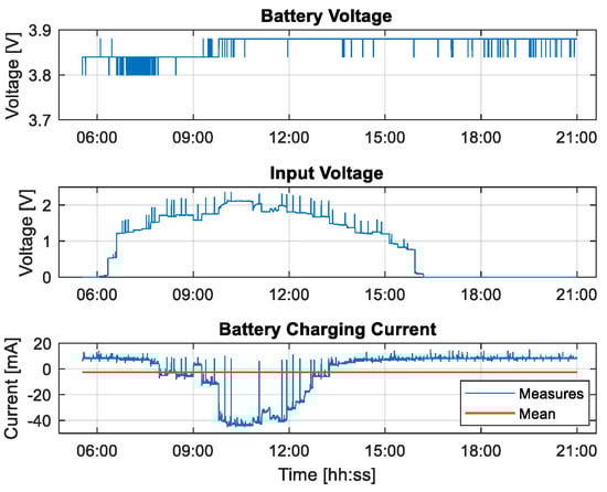 Exemplary acquired data representing the energy harvesting system charging the sensor node battery during one day (23 February 2023).