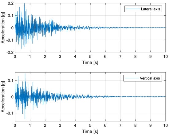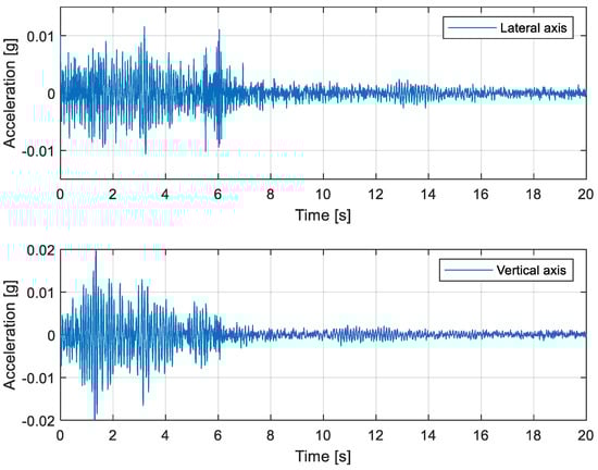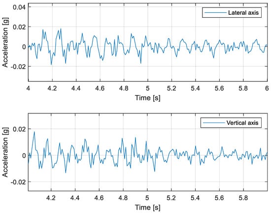 Exemplary acceleration time histories acquired by the wireless sensors triggered by the train passage on the lower deck.