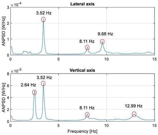 where fk represents the discrete frequency and n is the number of discrete frequencies. The peaks of the ANPSDs, obtained through the elaboration of the data collected by wireless sensor nodes, were then used to estimate the natural frequencies of the bridge and the results of this procedure are visible for lateral and vertical axes in Figure 11.