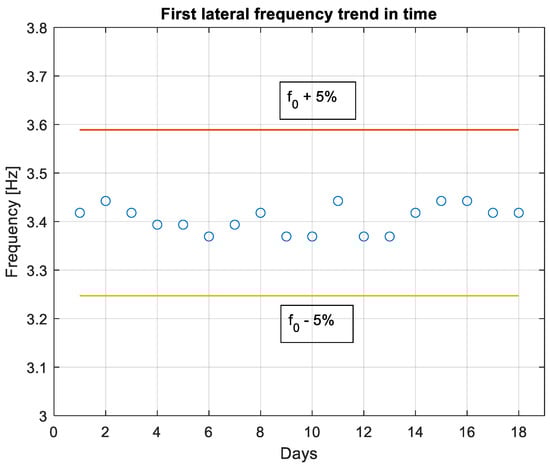 In order to understand if the natural frequencies computed through the data coming from wireless sensors present a too high scatter to be potentially adopted as diagnostic parameters, their variation in time is considered. In particular, the trend in time of first lateral frequency values estimated by sensor nodes over an 18-day time window is considered in Figure 12. As can be noticed, the variation of this parameter does not present a clear decreasing trend, and it is anyway well below a ±5% variation with respect to the starting detected frequency value.