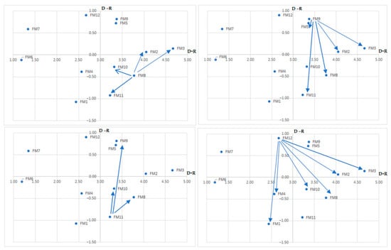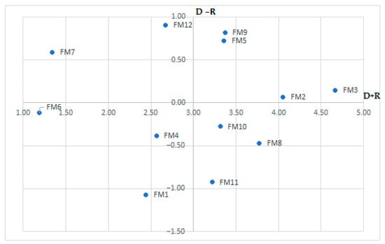 The horizontal axis (D + R) and vertical axis (D − R) are used to represent the cause and effect diagram, respectively. The diagram simplifies complex causal relations into an easy-to-understand visual structure. Decision-makers can determine factor types based on the characteristics of the factors and formulate appropriate solutions based on the extent of influence of each factor [21].