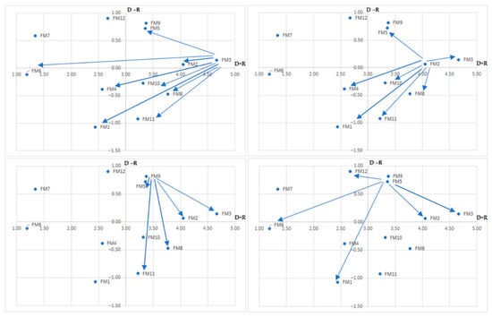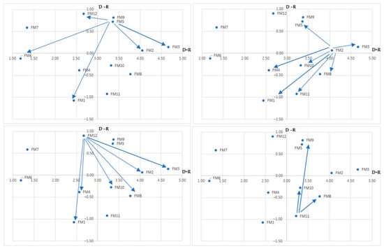 The conventional PFMEA model has only one failure mode (FM9) in the first quadrant, FM12 in the second quadrant (close to the first), and two failure modes (FM8, FM11) only in the third, although both with higher significance (Figure 6). We refer to only two failure modes as causative, namely FM9 and FM12. We assume that this model will also reduce the monitored criteria, though as compared to the DEMATEL and ERPN models with a lower success rate. This is also indicated by auxiliary criteria regarding the number of affected failure modes with average and lower intensity.