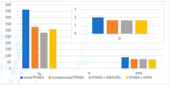 Based on Figure 7, we can conclude that our prediction of the estimation of the model’s functionality was correct. We recorded the lowest number of defective products with the DEMATEL model. The categorization of occurrence O was at the same level for all proposed models. Improvements occurred only in failure modes to which measures were specifically applied. We recorded the lowest average RPN value for the ERPN model. However, it should be emphasized that criteria O and RPN do not have such a telling value and are not as specific as the number of defective products.