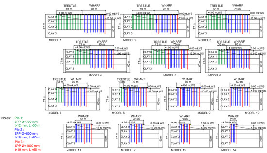 Scenario 1 (without a soil slope) pile-supported wharf configurations.