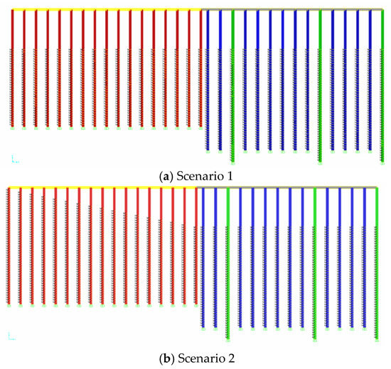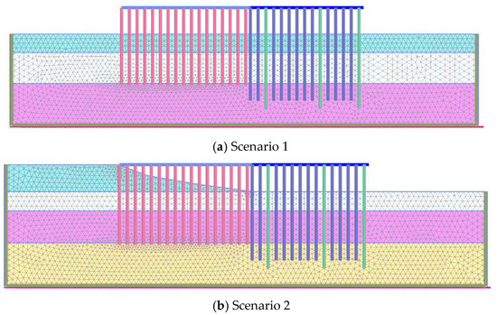 In the FEA, the wharf deck was modeled using plate elements and the piles were represented using an embedded beam row element. The embedded beam row element enables the 2D modeling of piles with out-of-plane spacing, which has been validated by comparisons with a three-dimensional (3D) FEA simulation and data from actual testing. In the embedded beam row element, the pile is separated from the 2D soil model, which makes the soil mesh continuous. Special interface elements between the soil mesh and embedded pile are employed to consider the soil–pile interaction. Sluis et al. [25] compared the 2D embedded beam row model with the 3D embedded pile model for axial and lateral loading, and it was found that the displacement of an embedded beam row model was comparable to the 3D pile displacements. Dao [26] also demonstrated the applicability of the embedded beam row model by comparing the response of the embedded beam row model and experimental results.