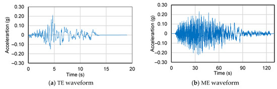 To discuss the structural seismic response, various ground motions should be considered [27,28,29,30,31] together with site-specific ground motions [32,33]. The simulations used two waveforms with different characteristics: the 1968 Tokachi-Oki earthquake (TE) and the 2020 Mentawai earthquake (ME). The ME waveform was modified to match the target Indonesian site class SA [34]. These waveforms were deconvoluted at the bedrock, and the peak acceleration and duration were 0.210 g and 19 s for the TE and 0.215 g and 130 s for the ME, as illustrated in Figure 4. The structure’s inelastic behavior may have catastrophic consequences [35,36]; thus, many vital structures (e.g., PSW) were designed to remain in an elastic state during earthquakes. We focused on the elastic response of the PSW; therefore, we multiplied the waveforms by 0.8 to reduce their amplitude so that the structural members in the analysis remained in an elastic state during the earthquake.
