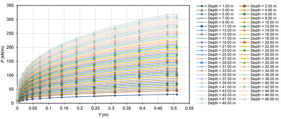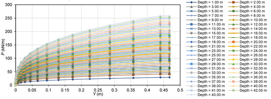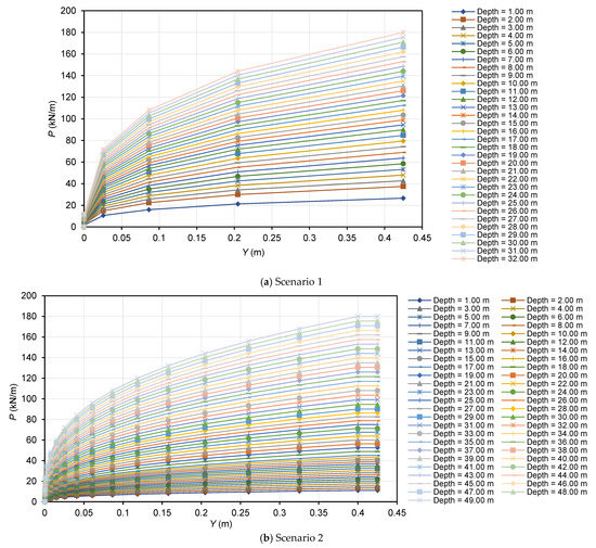 The SAP 2000 [37] software was used to create a 2D FA model (Figure 5). Piles and beams were modeled as rigidly connected frame elements. To describe the relationship between the soil reaction (P) and the lateral displacement (Y) around the piles for each soil layer with depth, we used soil spring elastic-plastic P-Y curves. The P-Y curve for the spring properties was calculated using the L-PILE [38] computer program based on a study by Matlock [39]. Figure 6, Figure 7 and Figure 8 show the P-Y curves at different depths below the seabed. Figure 6 depicts the ultimate soil resistance for the Ø1000 mm pile at a depth of 1 m as 26.5 kN for Scenario 1 and 11.1 kN for Scenario 2. This difference is due to differences in the properties of the soil layers at the ground surface in Scenarios 1 and 2, where the undrained cohesion of the Scenario 1 surface layer (Clay 1) is greater than that of the Scenario 2 surface layer (Clay 0). The undrained cohesion was based on a correlation with N-SPT, according to Terzaghi et al. [40]. Figure 7 and Figure 8 describe the ultimate soil resistance for the Ø1100 and Ø1200 mm piles at a 1 m depth, which were 29 kN and 31 kN, respectively, for Scenarios 1 and 2. In general, the P-Y curve demonstrates that the larger the diameter of the pile, the greater the soil resistance.