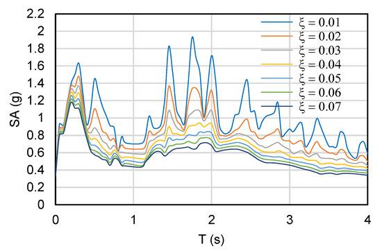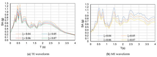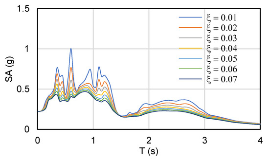 The SAs generated by the 1D soil–column seismic response analysis using TE and ME waveforms based on the damping coefficient (ξ) = 0.01–0.07 are illustrated in Figure 9 and Figure 10, respectively. Figure 9 shows that the TE waveform has a large SA in the period shorter than 1.0 s, with the largest SA being 1.0 g at 0.6 s. Figure 10 shows that the ME waveform has a large SA in a period longer than 1.0 s, with the largest SA being 1.9 g at 1.75 s.