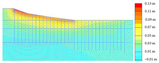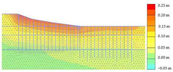 The FEA residual displacements of the TE and ME waveforms are described in Figure 11 and Figure 12, respectively. The displacement decreased with increasing distance from the top of the slope. The most significant displacement occurred at the top of the slope at 0.13 m and 0.25 m due to the TE and ME waveforms, respectively.