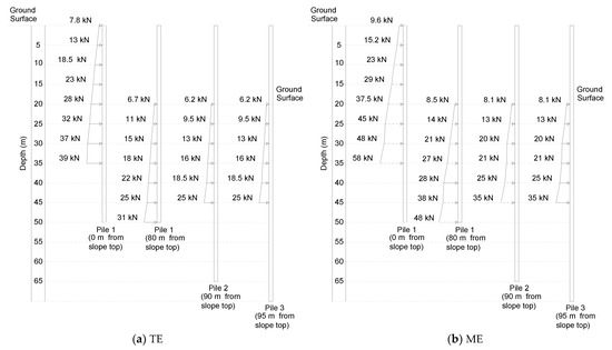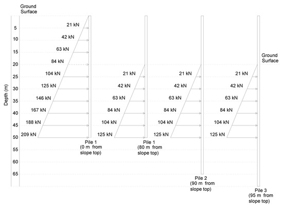 Although existing lateral spreading soil pressure models have been proposed based on test results, significant differences have been observed among the soil pressures proposed by the studies described above. Therefore, selecting the correct kinematic force for pile design practice is challenging [18,19,20]. In addition, the suggested soil pressure models were obtained primarily from the results of single-pile tests. According to the FEA results of PSW pile groups on a gentle soil slope, the soil pressure decreases with increasing distance from the top of the slope [6]. Therefore, existing soil pressure models based on single-pile testing do not apply to pile group scenarios—a method of predicting the kinematic forces acting against pile groups on a soil slope needs to be developed.