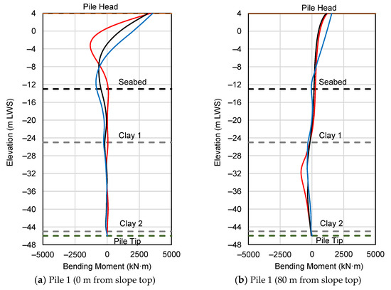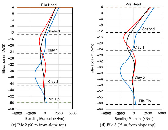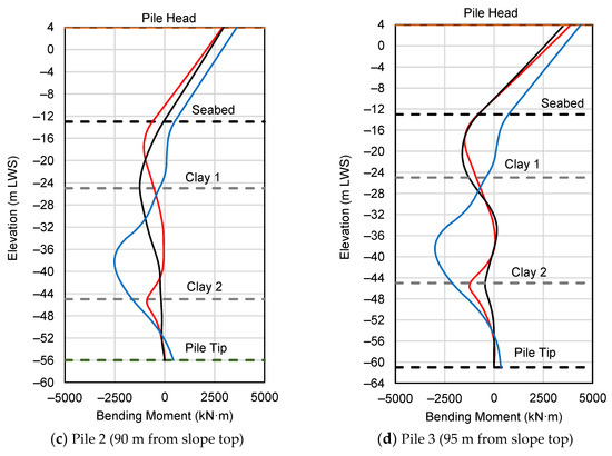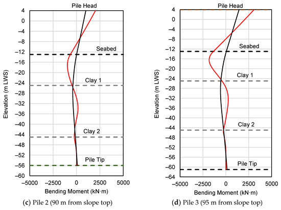 Figure 16c,d and Figure 17c,d show the differences in the bending moments observed at piles located outside the slope area. This indicates that at a depth of 36–40 m, the JRA method’s bending moment becomes excessive because of the triangular distribution of the kinematic force. By contrast, the bending moment calculated using the proposed method produced reasonable results compared to the FEA. For example, as shown in Figure 16c, at 40 m depth, the JRA method produced a bending moment of 1723 kN·m while the proposed method and the FEA produced bending moments of 166 kN·m and 115 kN·m, respectively.