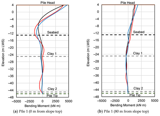 Figure 16 and Figure 17, respectively, depict the bending moment distributions due to the TE and ME waveforms for Scenario 2. The red line represents the result of the FEA, while the black and blue lines represent the results of the FA employing kinematic force determined by the proposed method (Figure 13) and the JRA method (Figure 14), respectively. The bending moment obtained from the FA using the proposed method agrees with the FEA results. In comparison, the FA bending moment produced by the kinematic force using the JRA equation yields more conservative results. For example, in Figure 16b, the FEA produced a maximum bending moment of 1222 kN·m, while the FA using the proposed method and the JRA method produced 1154 kN·m and 1559 kN·m, respectively.