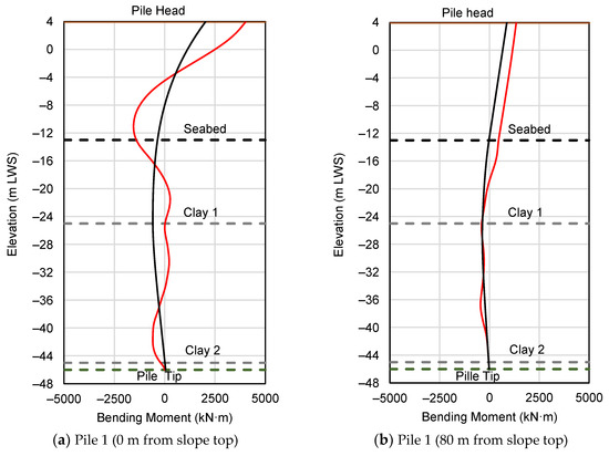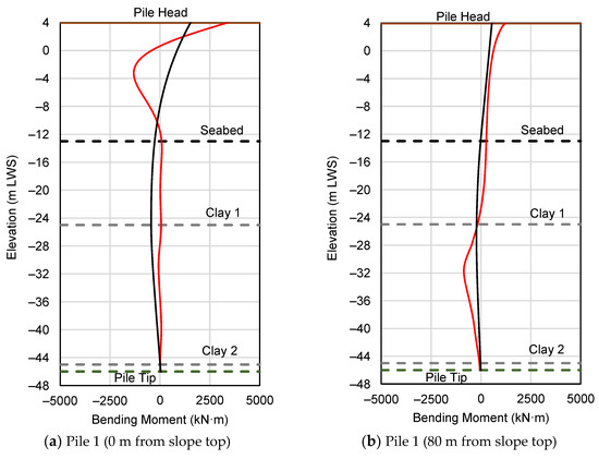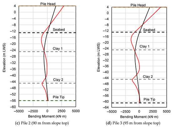 The FA’s bending moment distributions for Scenario 2 considered using only the inertial force (black line) and the FEA results (red line) due to the TE and ME waveforms, respectively, are compared in Figure 18 and Figure 19. The FA bending moment produced by the inertial force is only about half of the FEA bending moment. This indicates that the incorporation of kinematic force in the analysis is crucial for obtaining an appropriate bending moment in the case of a PSW on a soil slope.