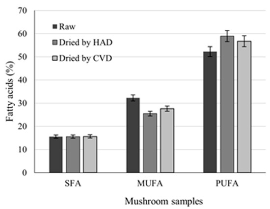 3.2. Fatty Acid Content of Raw and Dried B. edulis Mushrooms by GC–MS Analysis