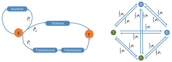Insertion and deletion errors occur mainly during DNA synthesis, and substitution errors occur mainly in DNA sequencing []. Thus, the error probability is influenced by synthesis and sequencing techniques. Nanopore and Illumina sequencing are advanced sequencing methods. Compared with nanopore sequencing, Illumina sequencing has the advantage of high reading accuracy, i.e., Illumina sequencing has lower probabilities of base insertion, deletion, and substitution errors. In this paper, we used a channel model on the basis of Illumina sequencing [], as shown in Figure 1.