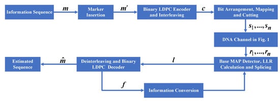 Channel error correction is a key part of DNA storage technology. In DNA synthesis and sequencing, insertion, deletion, and substitution errors of nucleotide bases occur []. Since DNA molecules use four nucleotide bases (i.e., adenine (A), thymine (T), cytosine (C), and guanine (G)) to store genetic information [], DNA is a quadratic channel corrupted by insertions, deletions, and substitutions. To correct synchronization (i.e., insertion and deletion) errors, Matthew C. Davey proposed the concatenated watermark code scheme [], and Daniel Marco proposed the concatenated marker code scheme []. To correct DNA channel errors, a modified concatenated watermark code scheme and a modified concatenated marker code scheme were proposed in [,], respectively. The former uses watermark codes as inner codes and low-density parity-check (LDPC) codes [] as outer codes. The latter employs the marker codes as inner codes and LDPC codes as outer codes. In these schemes, watermark and marker codes only assist in regaining synchronization, and they play no role in LDPC decoding. Therefore, these schemes have the disadvantage in error correction performance.To improve error correction performance, we designed an improved error correction scheme for DNA data storage.