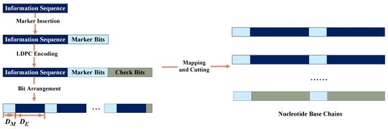 The procedure of the improved marker code scheme is shown in Figure 3. The encoding process is shown in Figure 4. First, binary sequence , including information bits and marker bits, is encoded as the information part of the LDPC code. Then, the LDPC code is interleaved to obtain the codeword . Second, sequence is arranged to guarantee that the marker bits are uniformly distributed. In other words, marker bits are placed at each interval . Next, the arranged sequence is mapped into a nucleotide sequence and cut into several short nucleotide chains because DNA long chains are difficult to synthesize. Lastly, sequences enter the channel and correspondingly output sequences .