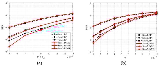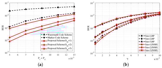 Figure 6a shows the variation in the BER with probabilities , at . Figure 6b shows the the variation in the BER with parameter related to the substitution errors at and . Figure 6 shows a comparison of the performance of the INMS and BP algorithms in the proposed scheme, and the BER performance of the INMS algorithm was approximate to that of the BP algorithm, which verified the effectiveness of the INMS algorithm. In Figure 6b, the BER of the INMS algorithm was higher than that of the BP algorithm when because the INMS algorithm used approximate replacement in the check node update and thus lost some performance. However, the BER of the INMS algorithm was lower than that of the BP algorithm when because the INMS algorithm achieved a better reduction in the correlation effect among the messages after several iterations. A similar case appeared in []. The performance of the INMS algorithm was approximate to that of the BP algorithm in all cases. An appropriate correction factor was selected for the INMS algorithm to obtain the above results. Here, , which was obtained with numerous simulations.