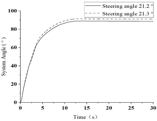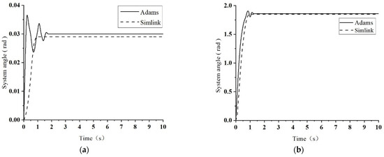 Based on the above model, the Matlab-Simulink mathematical model was constructed. Taking the towing speed of 30 km/h and the ground adhesion coefficient of 0.8 as the experimental conditions, the change trends of the angle between the system tractor and the aircraft in the Adams dynamic model and the mathematical model when the system steering angle was 4° and 15° were compared, respectively. The comparison test results are shown in Figure 5a,b.