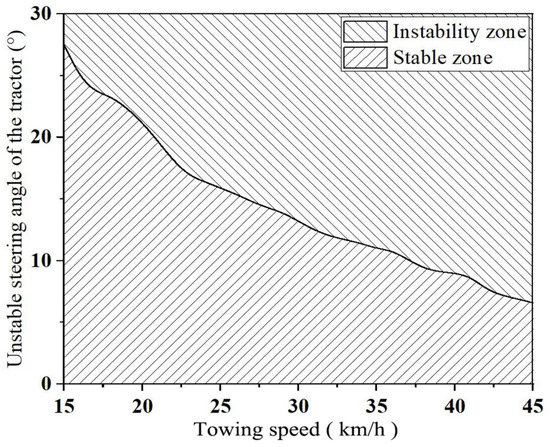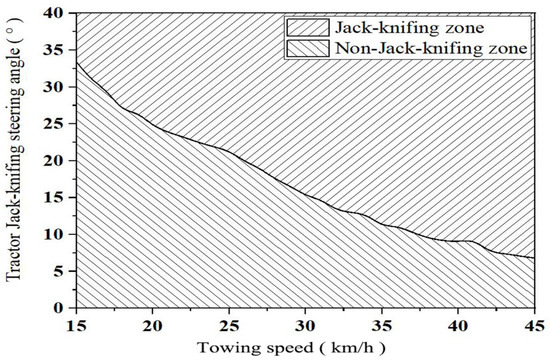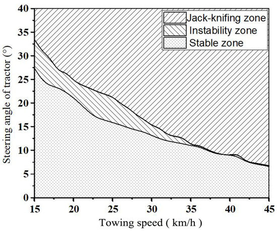 Stability zone diagram of 15–45 km/h towing speed and tractor steering angle.