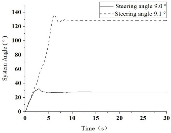 Figure 7 depicts the temporal variation of the system angle as the tractor’s steering angle increases from 9.0° to 9.1° during the taxiing of the towing system at an initial speed of 40 km/h. The sudden rise in the angle signifies the occurrence of the jack-knifing phenomenon due to the lateral instability of the system. Consequently, it can be inferred that the lateral instability of the system arises during the jack-knifing phenomenon at 40 km/h, and this continues until 25 km/h. As demonstrated in Figure 8, while the entire system is sliding at an initial speed of 25 km/h, there is no significant change in the system’s included angle as the tractor’s steering angle increases from 21.2° to 21.3°, making it impossible to determine the lateral instability of the system from this representation. Therefore, the most straightforward approach to detect the lateral instability of the system is to detect whether the lateral force of the tire surpasses the maximum static friction force of the lateral slip.