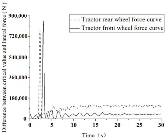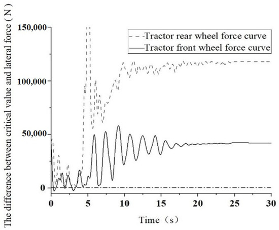 As depicted in Figure 11, the lateral force diagram of the front and rear wheels of the tractor is illustrated when the steering angle of the tractor reaches 9.1° under the velocity of 40 km/h. It was discerned that the emergence of lateral slip on the tire and consequent lateral instability of the towing system occurs only when the steering angle of the tractor equals or exceeds 9.1°.