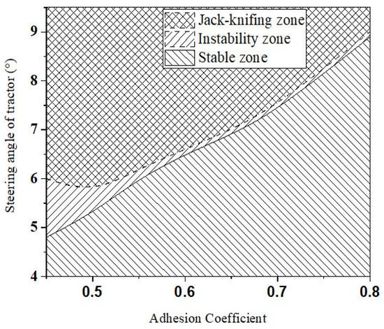 On asphalt or concrete pavement, the lateral stability of the towing system is divided into three zones; namely, the jack-knifing zone, instability zone, and stability zone. It can be inferred that a higher adhesion coefficient of the ground leads to better lateral stability of the towing system and reduces the likelihood of instability.