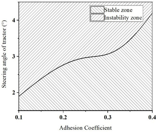 The lateral stability of the towing system under snow and ice road conditions can be categorized into two zones: the stability zone and the instability zone. It can be inferred that when operating on snow- and ice-covered roads at high speeds, the tractor should steer clear of causing any lateral instability of the towing system. Furthermore, it can be deduced that the stability of the towing system will increase as the adhesion coefficient of the snow- and ice-covered road increases.