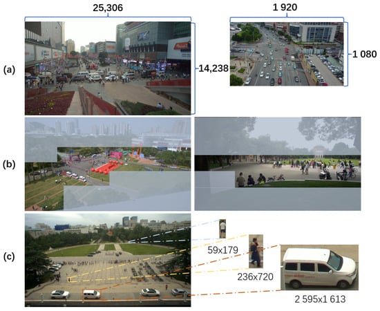 This paper is based on the gigadetection track of the gigavision competition held by Tsinghua University in 2022. The gigadetection track included object detection for pedestrians and vehicles. The training set contained 390 pictures in 13 scenes, and the competition test set contained 165 pictures in 5 scenes; each picture had a resolution of gigapixels and contained a large number of multi-scale objects. Pedestrians and vehicles had different representations and categories. Pedestrians had different postures (‘standing’, ‘walking’, ‘sitting’, or ‘riding’) and different ages (‘adult’ or ‘child’). Vehicles had different sizes (‘small car’, ‘midsize car’, or ‘large car’) and categories (‘bicycle’, ‘motorcycle’, ‘tricycle’, ‘electric car’, or ‘baby carriage’). The main challenges of this competition were that: (1) The size of the images was much larger than any previous dataset. For the PANDA dataset, the mAP of our method was 61.4 %. In the 31 December 2022 https://www.gigavision.cn/ competition, our method was placed 10th. As shown in Figure 1a, the width and height of the images in the VisDrone dataset are only 1920 pixels and 1080 pixels, respectively, which is one-tenth the size of the PANDA dataset images. This means that PANDA has an image area hundreds of times larger than VisDrone. Existing detectors cannot directly perform object detection on such images. (2) There was a large background area in the image. As shown in Figure 1b, almost two-thirds of the area had no targets. This meant that an unbalanced number of positive and negative samples would lead to performance damage when we performed object detection on this image. (3) Figure 1c depicts the large difference in the target sizes of pedestrians and vehicles, which meant that if the cropping size was too small, the vehicles would be easily cut into pieces, and if it was too large, the pedestrian targets would be too small to detect. Due to these challenges, we made a series of improvements, and the experiments and competition results proved that our improvements were effective.