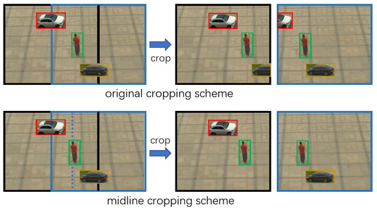 It can be seen from Figure 3 that the original image cropping scheme produced a cropped target, contained in the left sub-image in orange. When the two sub-images were finally fused, the cropped target frame that NMS could not remove led to performance degradation. As shown at the bottom of the figure, we made a decision at the midline of the overlapping part of the two pictures. If the target was on the left side of the midline, the right sub-picture discarded the target. Using the midline cropping scheme stopped this from happening.