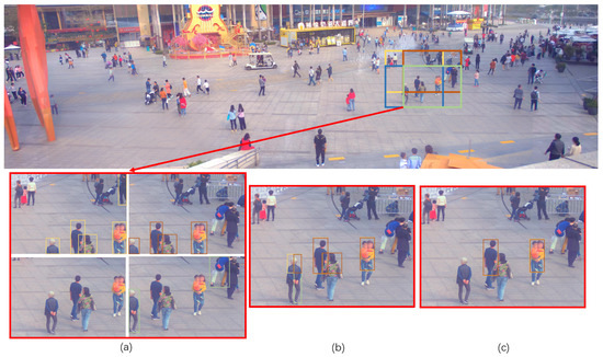In the PANDA dataset, we used overlap to crop the images, as shown in Figure 4. After predicting the cropped sub-images, we needed to fuse them into the original image and remove the non-maximum value frame by NMS. However, as shown in Figure 4b, some of the cropped objects could not be removed by NMS, and the confidence of these boxes was usually high, which would seriously affect the performance. When fusing cropped sub-images into the original image, we used the midline strategy to significantly improve the performance, which is shown in Figure 4c. This was because we removed a large number of small cropped objects that could not be removed. This method could generate improvements of 2%, as shown in Table 1.Both experiments and visualizations demonstrated that this approach improved the performance of the object detectors.
