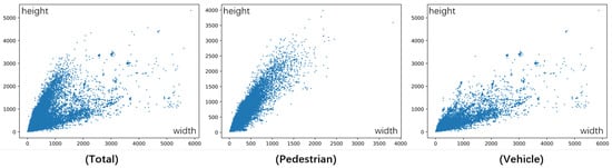 In order to choose an appropriate image cropping scheme, we analyzed the target size of the training set, and the results are shown in Figure 5. When we cropped the image with a width and height of 6000 × 4000, most of the targets were guaranteed to not be cropped. Since the object detector resized the long side of the image to 1472, some small targets became hard to recognize at this scale. If we used a size of 3000 × 3000, many large objects would be cropped. According to the visual analysis in Figure 5, we cropped pedestrians and vehicles to their appropriate sizes and trained the models separately.
