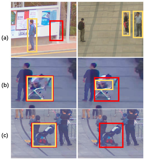 Visualization of some problems. (a) The baby carriage (red box) is severely occluded by the billboard, and the person on the left of the right image is unlabeled. (b) Detection of baby carriage with a baby. (c) Detection of baby carriage without a baby.