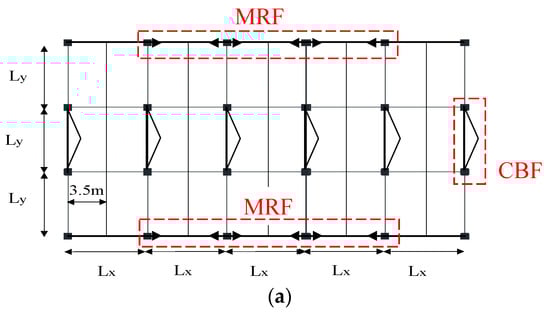 Perimetric moment-resisting frames (MRFs) were placed in the longitudinal direction, while X-concentrically bracing in the transverse direction (see Figure 1a). Figure 1b shows the vertical layout of the longitudinal side of the building, where it can be recognized that MRFs are located in the internal bays, and the outer bays are solely devoted to resist the gravity loads.