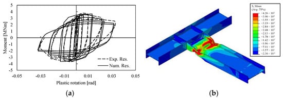 As can be observed in Figure 6, the FEM is able to mimic the experimental results in terms of moment–plastic rotation curves; moreover, the equivalent plastic deformations are consistent with the experimental damage pattern in [8].