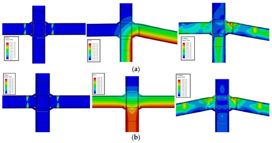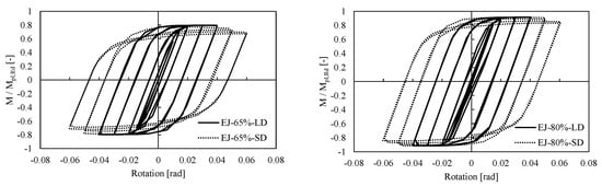 The results of both external and internal joints under cyclic loading at ambient temperature are depicted in Figure 7 in terms of moment–rotation curves (where the moment has been normalised to the plastic moment of the beam Mpl,Rd) and damage pattern, showing the distribution of the equivalent plastic deformations (PEEQ). For the sake of brevity, only the distribution of PEEQ of the joints is shown at 0.06 rad. As can be observed, the normalized response curves of RBS-80 and RBS-65 are very similar, although there is a difference in the width of the reduced beam flange.