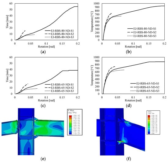 The results of FEAs of the undamaged joints subjected to the three considered fire scenarios (S1, S2, and S3) are presented in terms of time–rotation and temperature–rotation curves in Figure 8, where the Von Misses stress distribution of the EJ-80%-ND-S2 and IJ-80%-ND-S2 joints are also depicted.