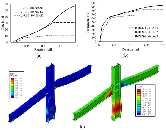 Results of the IJ-RBS-80 joints in terms of time–rotation curve (a), temperature–rotation curve (b) and PEEQ (c).