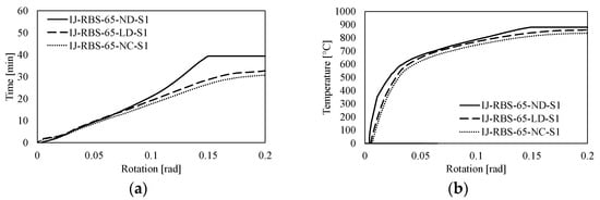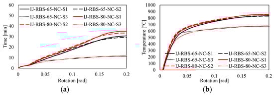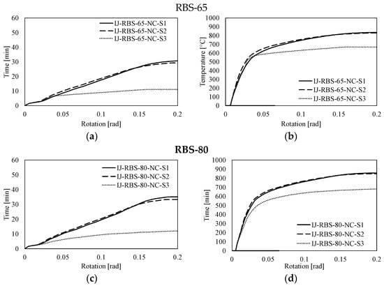 Similar to the results depicted in Figure 9, it can be observed that the resistance of the RBS influences the fire performance of the joint. In fact, independently from the fire scenario (S1, S2, and S3), the RBS-80 joints reach a greater ultimate temperature and resist for a longer time than RBS-65 (see Figure 13).