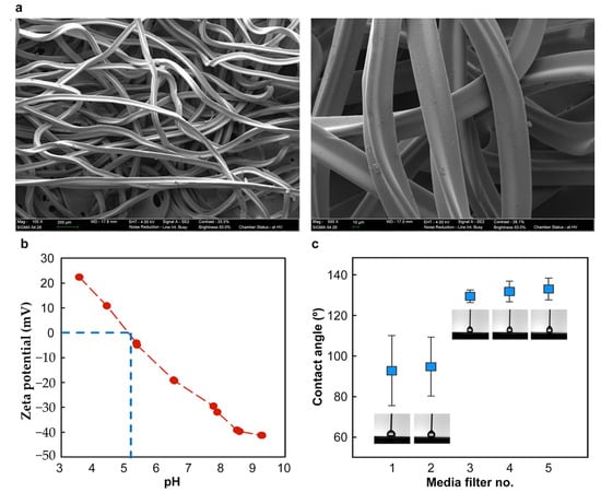 Characteristics of the fiber media filter as determined via (a) FE-SEM, (b) Zeta potential analysis. Blue line represents a isoelectro point of the multifiber medai filter. Isoelectro point means zeta potential equals zero when the object meets at specific pH (pH 5.09), and (c) water contact angle. The red line represents a zeta potential of whole multifiber media filter at different pH range.