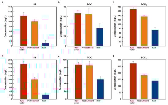 The RMF process exhibited stable SS removal efficiency in both weather types. Although the removal efficiencies of BOD5 differed and TOC rejection showed stability in both weather types, the concentration of organic matter in CSOs can contaminate an ecosystem when untreated water discharges into rivers. Hence, it is necessary to develop the pretreatment or posttreatment process of RMF.