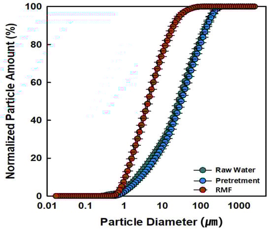 In this study, particle size analysis was performed to determine the characteristics of particulate matter treatment throughout the fiber media filter. Figure 4 shows that the particle size range was 2.18–143.4 µm (average 21.4 µm) for raw water, 2.73–148.4 µm (average 24.8 µm) after pretreatment, and 1.08–19.8 µm (average 4.45 µm) after the RMF process. Particle sizes up to 20.0 µm can be removed using the fiber media filter. In addition, the particle size distribution after pretreatment was slightly higher than that of raw water, as its lower retention time reduced the sedimentation effect for micro -substances with sizes less than 150 µm in the pretreatment process.