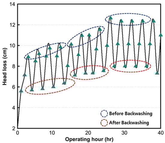 In this investigation, physical backwashing was commonly performed to remove adhesive contaminants from the surface of a fiber media filter. Figure 5 shows the head loss recovery in a radial-type multifiber media filtration process after physical backwashing. The head loss recovered by 40.5% after filtration. No improvement in the head loss recovery efficiency of the multimedia was achieved because the organic material in the CSOs formed a gel-like sticky layer on the surface of the media [33,34].