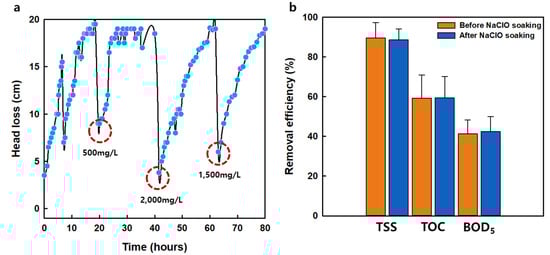 Figure 6 shows the result of the experiments performed once a week using different NaClO concentrations. Increasing the concentration of NaClO increased the cleaning efficiency at 500, 1000, and 2000 mg/L after 24 h of chemical soaking following 20 h of operation. The head loss of the radial multifiber media filtration process was efficiently restored through chemical soaking at a concentration of 2000 mg/L. The head loss recovery efficiency was 96.2% at 2000 mg/L of NaClO but was restored by only 65.2% and 84.5% at 500 and 1000 mg/L, respectively (Figure 6a). Compared to the removal efficiencies of virgin media filters (Figure 6b), the radial-type multifiber media filter exhibited stable removal efficiency after soaking at the highest NaClO concentration (2000 mg/L). The removal efficiencies after soaking at a concentration of 2000 mg/L were 88.5% for TSS, 59.4% for TOC, and 42.3% for BOD5.