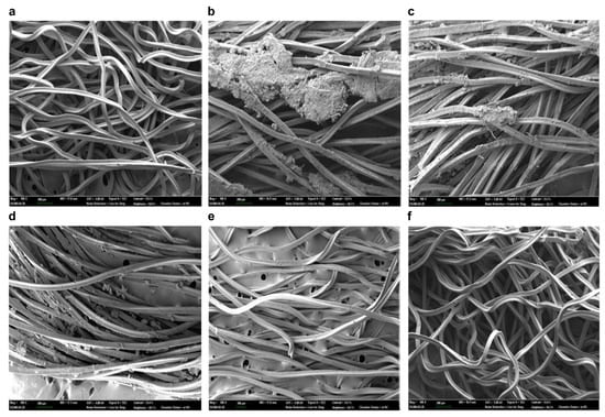 Scanning electron microscopy (SEM) images of the (a) virgin fiber media filter and fiber media filter after (b) 20 h of operation, (c) physical backwashing, (d) chemical soaking with 500 mg/L of NaClO, (e) chemical soaking with 1000 mg/L of NaClO, and (f) chemical soaking with 2000 mg/L of NaClO.